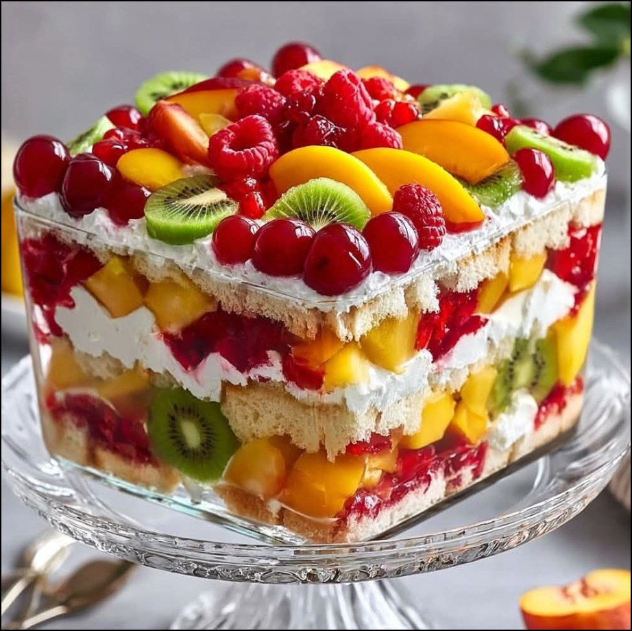 Deze gelaagde fruit trifle combineert zachte cake, luchtige slagroom en sappig vers fruit in één prachtige glazen schaal. Elke lepel bevat een perfecte balans van zoet, fris en romig.