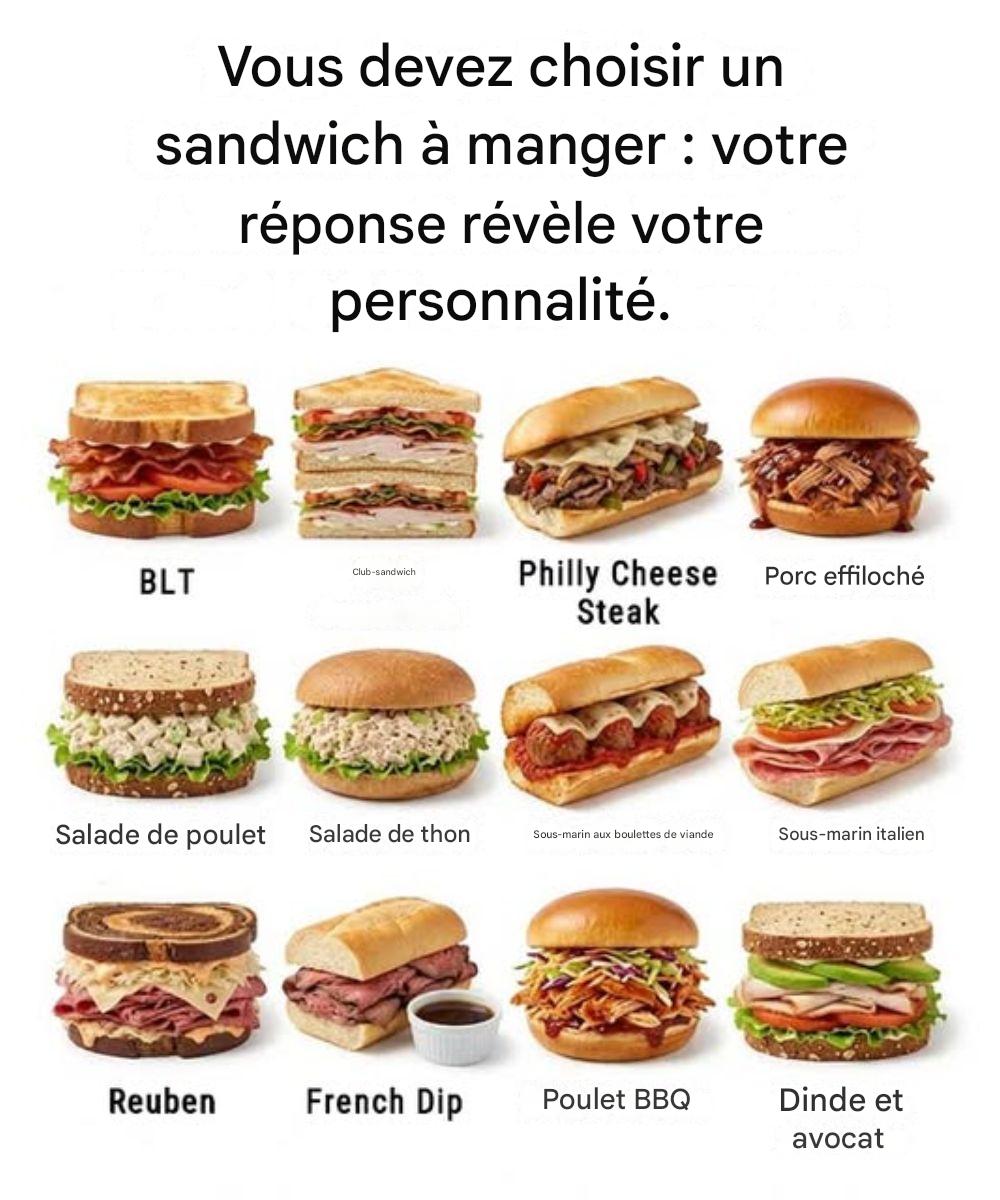 Wat als zoiets simpels als je favoriete sandwich veel over je persoonlijkheid zou kunnen zeggen? Voedselkeuzes weerspiegelen vaak meer dan alleen smaak; ze geven een hint over gewoonten, waarden en zelfs persoonlijkheidskenmerken. Kijk eens naar de sandwiches hierboven. Welke zou jij kiezen?