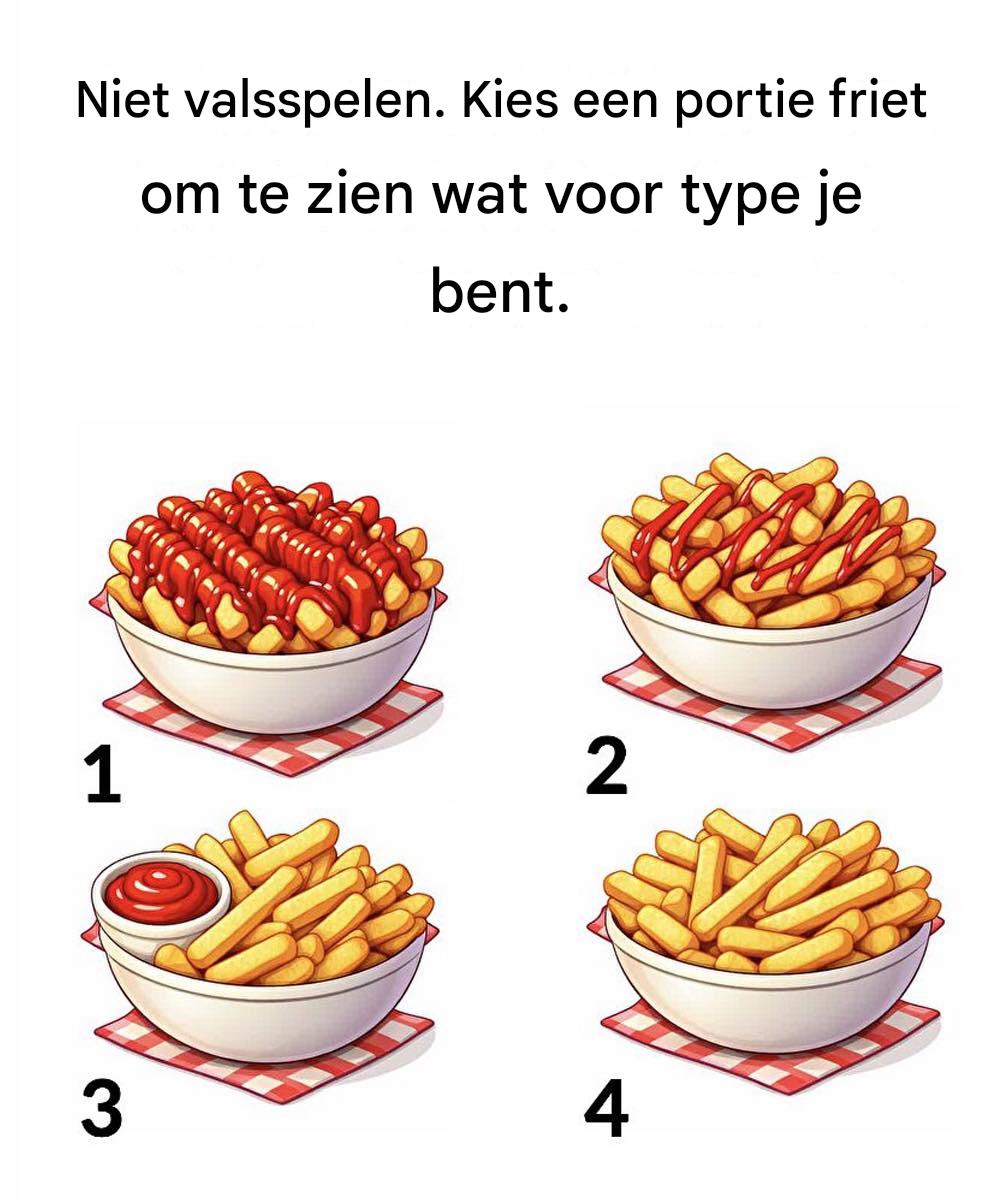 Op het eerste gezicht is het gewoon een bakje friet. Maar keuzes – vooral simpele – weerspiegelen vaak subtiele persoonlijkheidskenmerken. De afbeelding daagt je uit: "Niet valsspelen. Kies een bakje friet om te ontdekken wat voor soort persoon je bent."