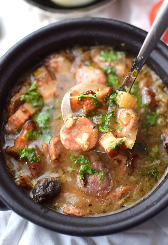 Bereiding van het gerecht: boerensoep met champignons en worst