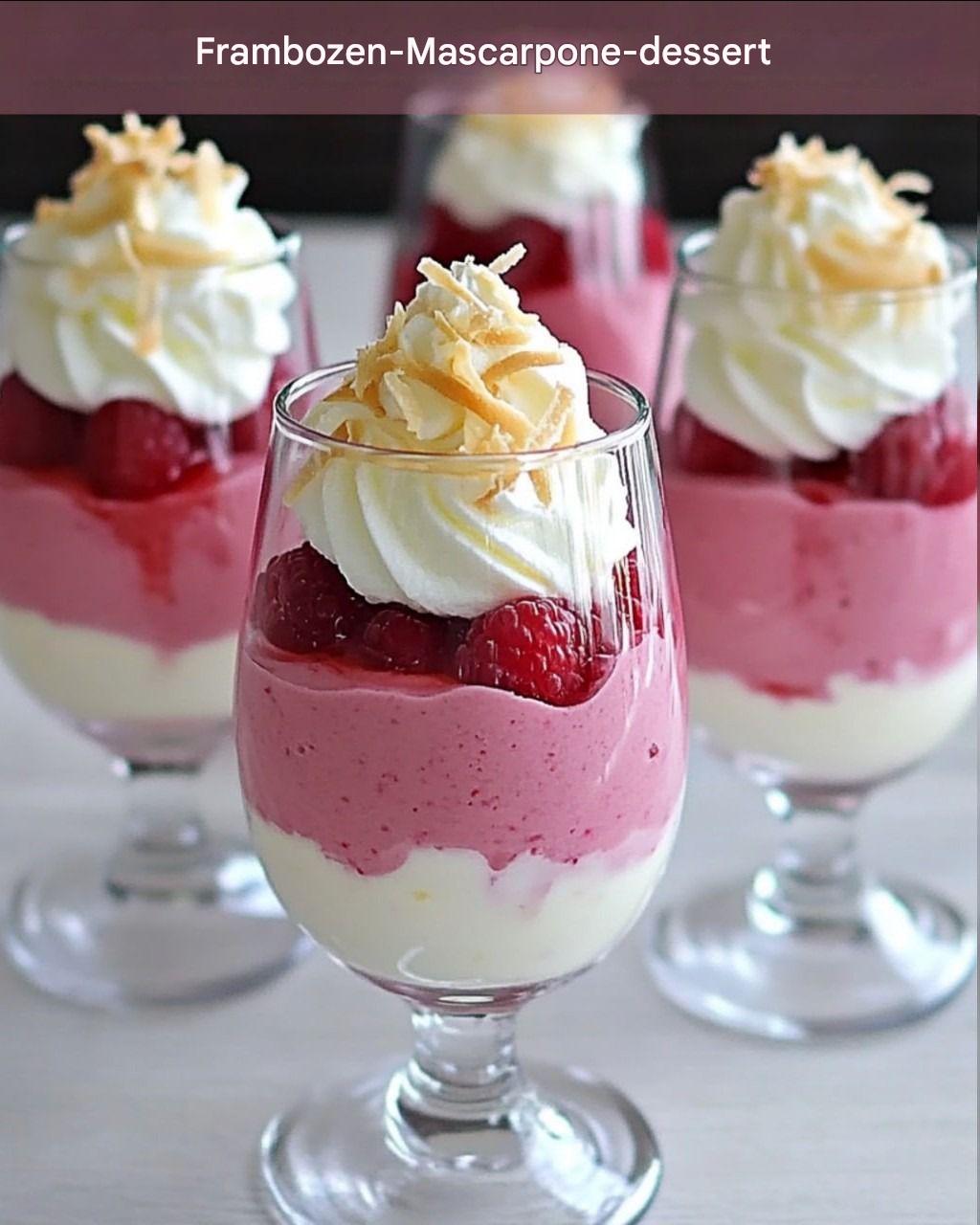 Een licht dessert, geserveerd in een glas, dat de fruitige smaak van frambozen combineert met de romigheid van een laagje mascarpone.