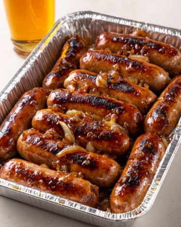 Tijdens het bakken ontstaat er een kleverige saus die zich om de worstjes en uien wikkelt — alsof alles langzaam wordt geglaceerd in pure smaak.