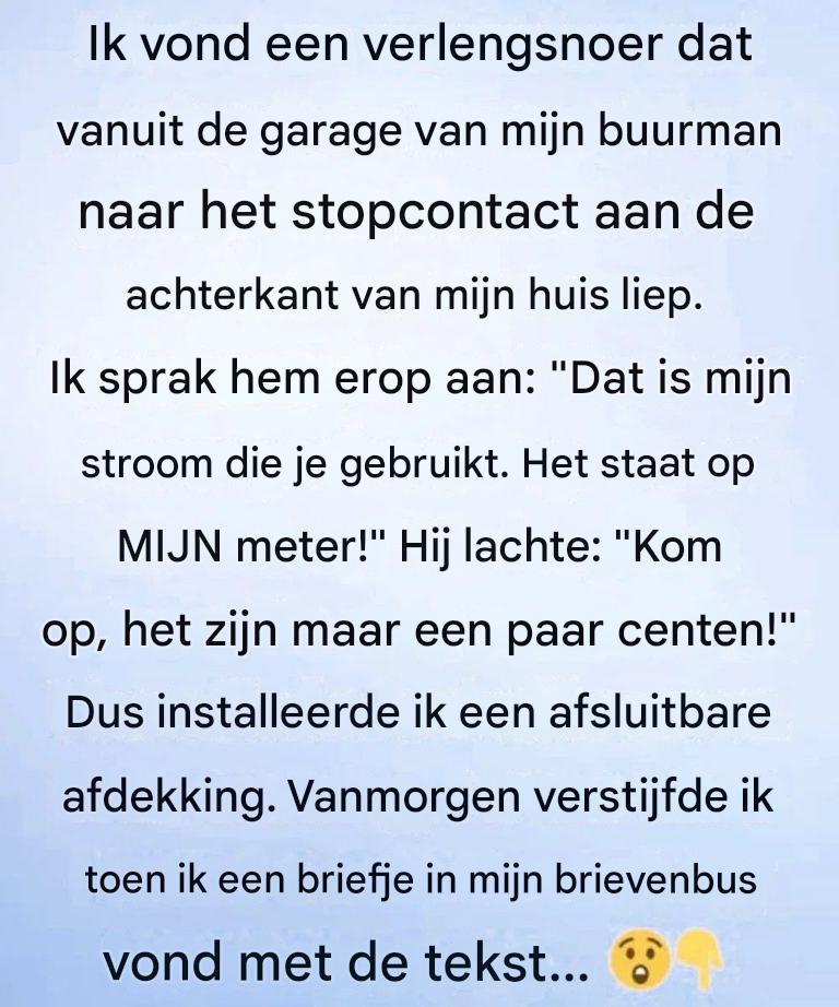 Later die dag besloot ik de situatie rustig aan te pakken. Ik zei tegen mijn buurman: “Hé, ik denk dat je per ongeluk je stekker in mijn stopcontact hebt gestoken – voor de duidelijkheid, dat loopt via mijn meter.” Hij lachte het weg en zei dat het “maar een beetje stroom” was, alsof dat het goedpraatte. Ik wilde geen spanning creëren, dus heb ik gewoon een klein afsluitbaar afdekplaatje op het stopcontact gezet – een simpele, respectvolle maatregel om toekomstige verwisselingen te voorkomen.