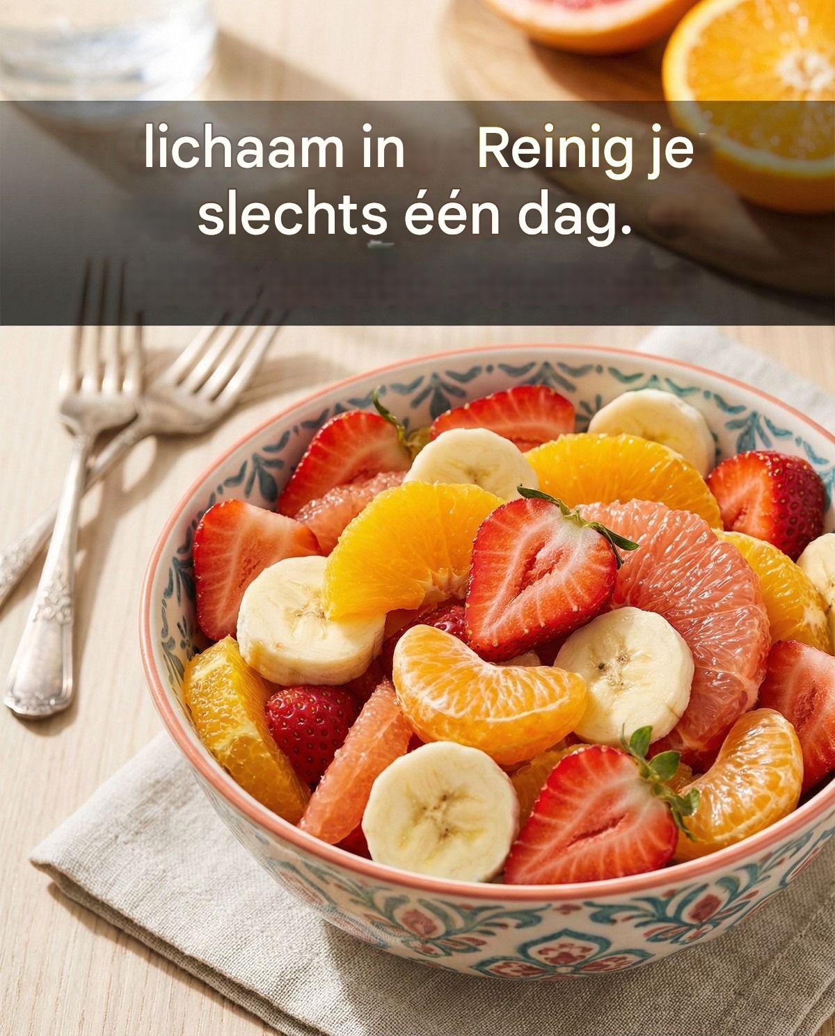 Ontbijt: Een fruitsalade – kan bestaan uit aardbeien, frambozen, bosbessen, bramen, kersen, appels, peren en een handje amandelen.